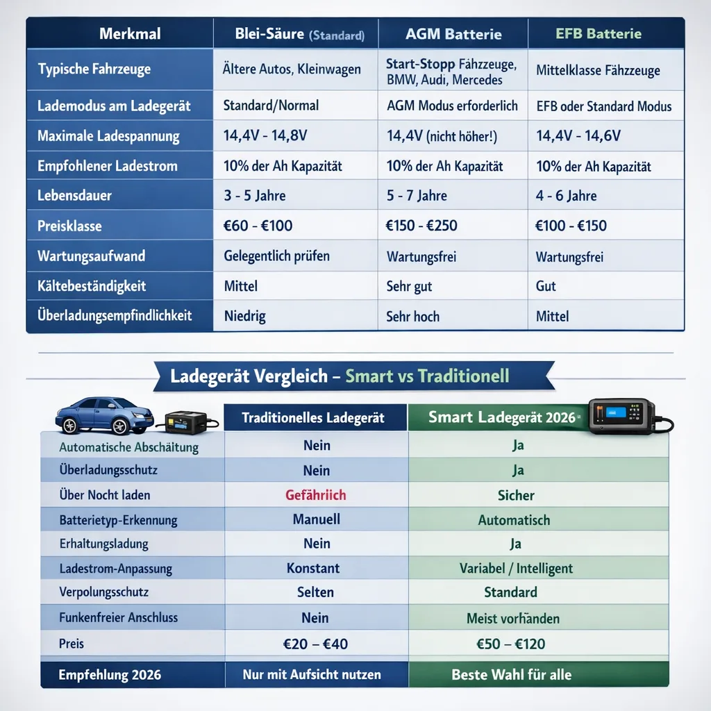 Das Ladegerät muss über einen AGM- oder EFB-Modus verfügen. Diese Modi begrenzen die Spannung entsprechend. Eine zu hohe Ladespannung führt zu einer schnellen Zerstörung dieser Batterien.