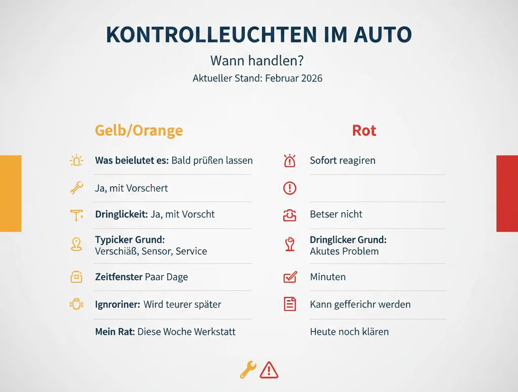 Die roten Auto-Kontrollleuchten sind für Notfälle gedacht. Behandeln Sie sie auch so. Die offizielle Bedeutung der Warnleuchtenfarben wird auch vom ADAC bestätigt, der zeigt, warum gelbe Kontrollleuchten als Warnhinweis gelten und rote Symbole sofortiges Anhalten erfordern.