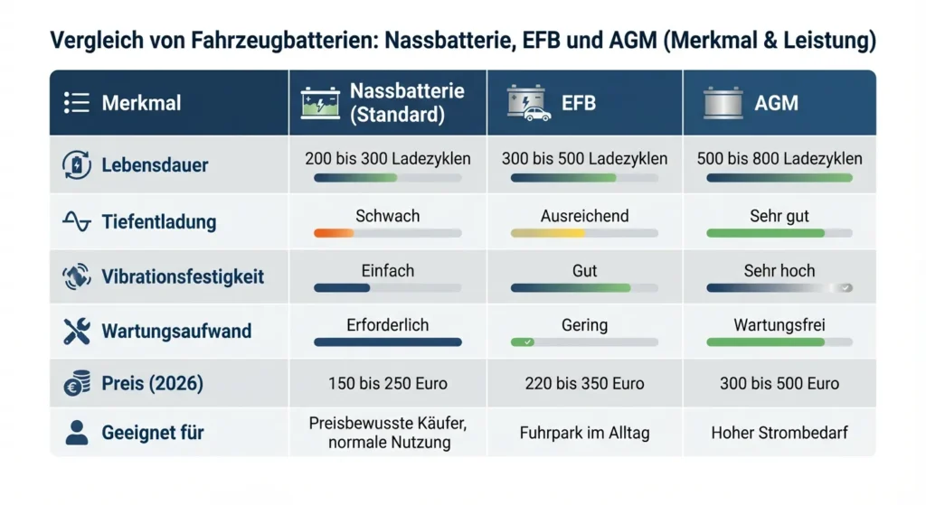 Stellen Sie sich EFB (Enhanced Flooded Battery) als das mittlere Kind vor. Besser als einfache Nassbatterien, günstiger als AGM. Flottenbetreiber in Deutschland scheinen diese für gemischt genutzte Fahrzeuge zu bevorzugen. Nicht die besten in irgendetwas, aber ziemlich gut in allem.